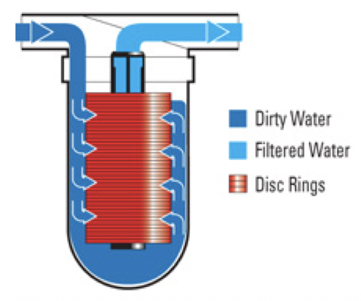 Disc filters work by forcing water between discs that have small ridges. As the water flows through the gaps between the ridges of the discs particulates too big to fit are filtered out. These filters are great at removing particulates, easy to maintain, low cost, and are customizable for most volumetric and filter size applications. Where they lack is that they can clog up quickly if not sized correctly, and are poor at removing organic contaminants.